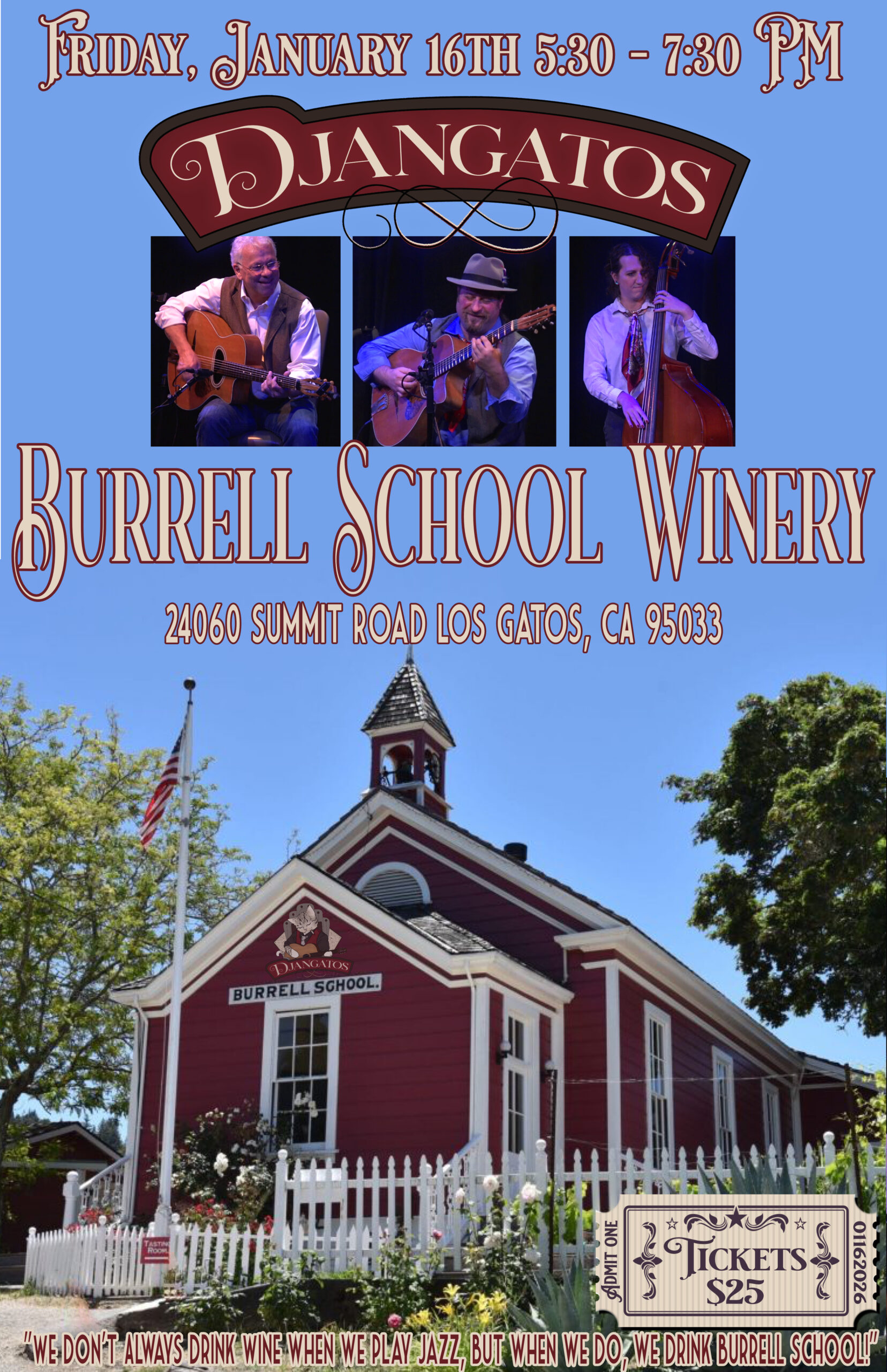 Come and spend your Friday night up at the winery enjoying live music in the Historic Schoolhouse from The Djangatos. Admission is $25 and includes complimentary Appetizer. Wine by the